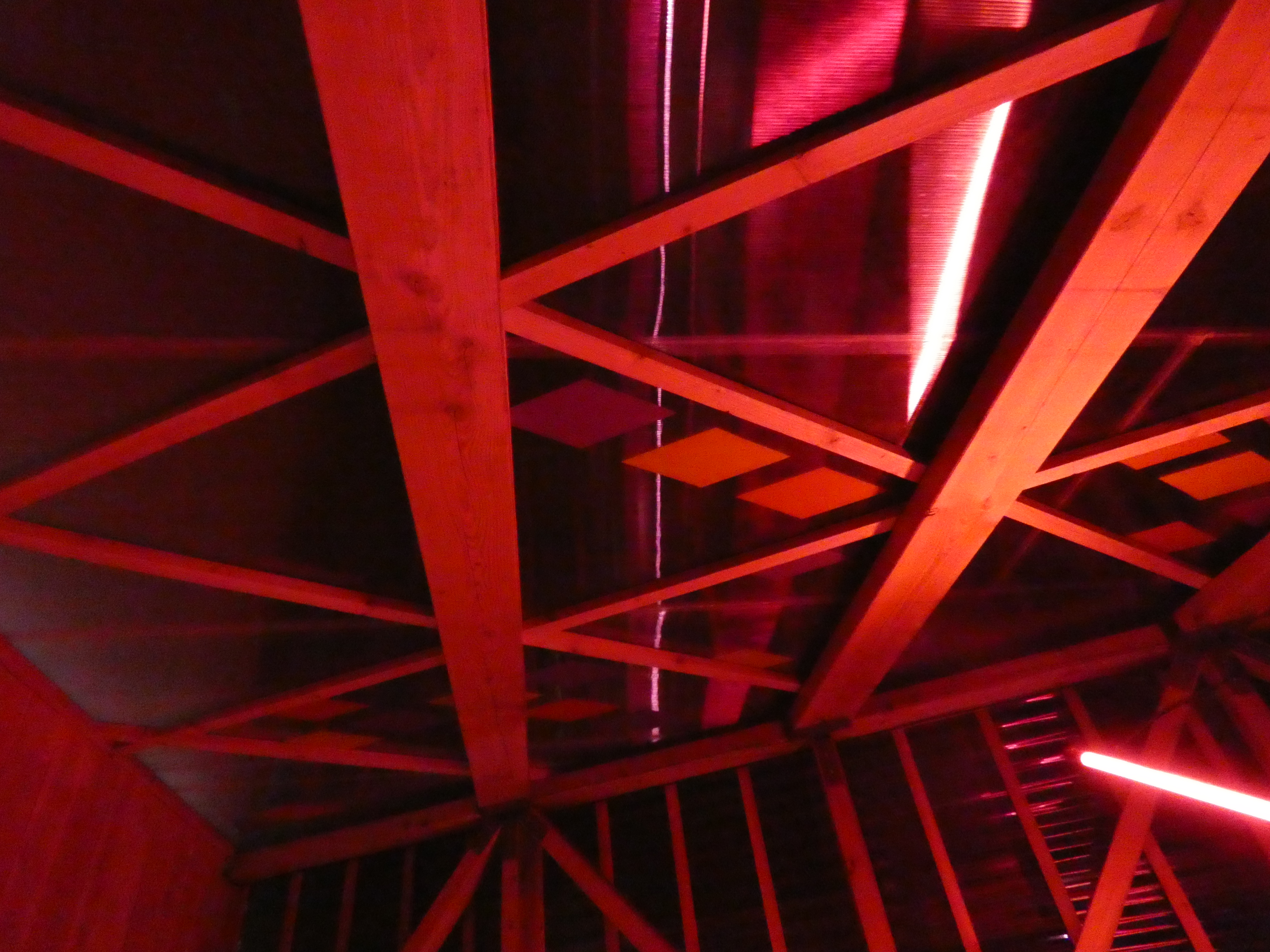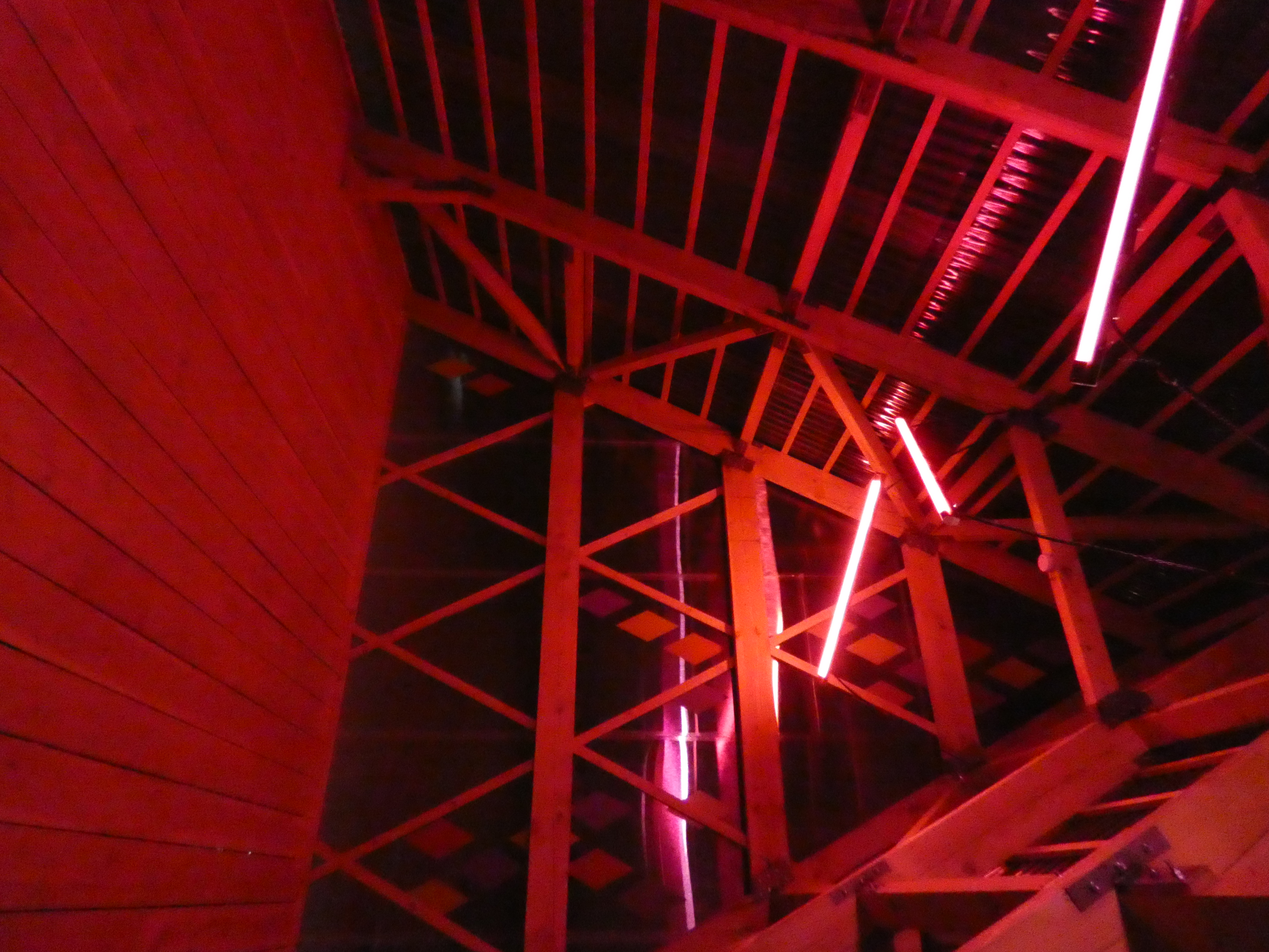 Marta Pasquetti, scénographe, a pensé et mis en place l’éclairage de la structure. Le rouge des terrils chargés d’oxyde de fer du territoire du sud du Luxembourg fut une des inspirations. Alléger la structure en lui donnant un côté volant via des éclairages rasants fut sa deuxième ligne de travail.