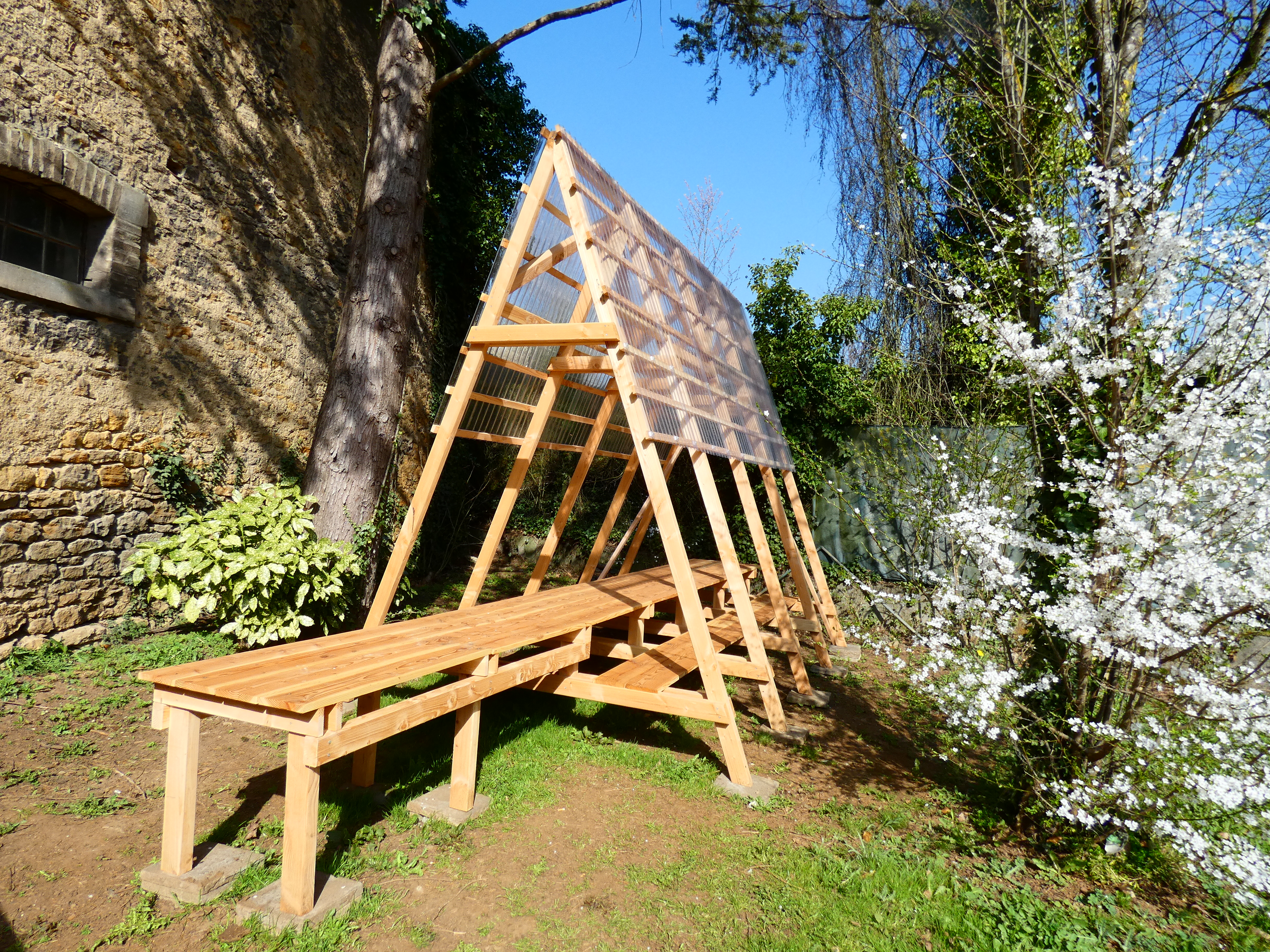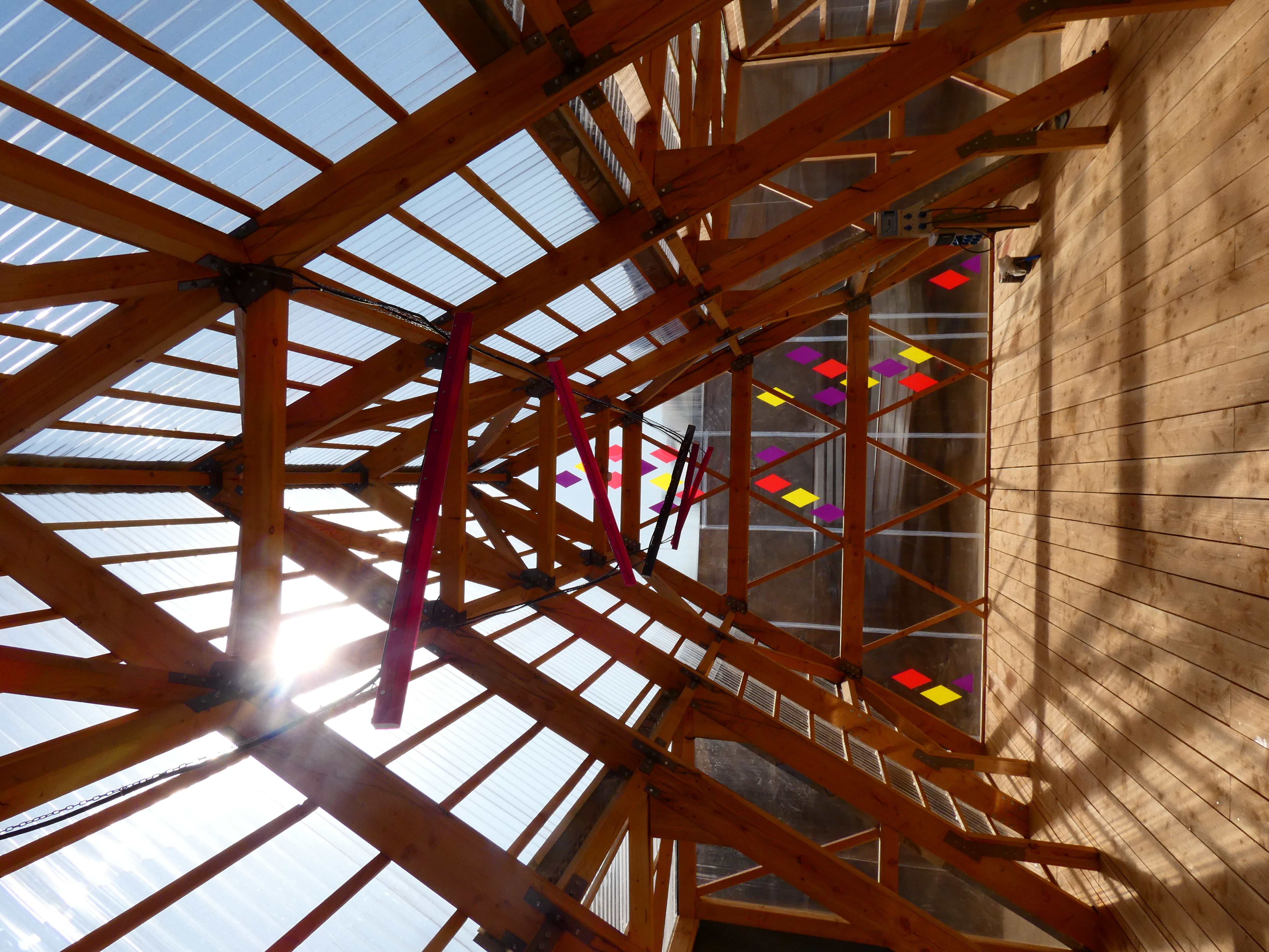 Arche triangulaire culminant à plus de 6m de haut, une porte coulissante permettant d’ouvrir quasi toute la structure, des assemblages inspirés des montages métalliques réalisés par l’industrie locale, du bois entièrement local, lestage modulable et facilement déplaçable, voici quelques-unes des contraintes sur lesquelles Lukas Hamilcaro, l’architecte lié au projet, s’est appuyé pour réaliser les plans de la structure.
